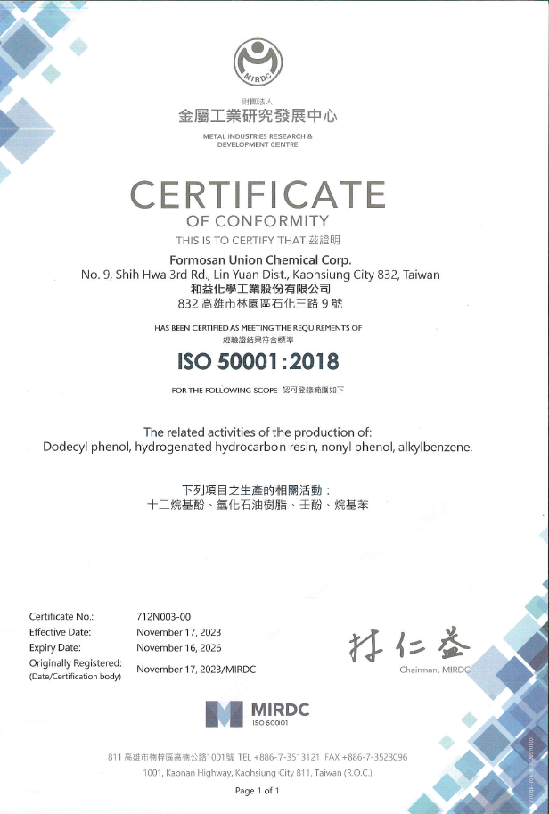 於2000年通過ISO 14001國際環境管理系統認證,並持續落實管理系統運行,現效期為2024.9.14起2027.9.13訖。